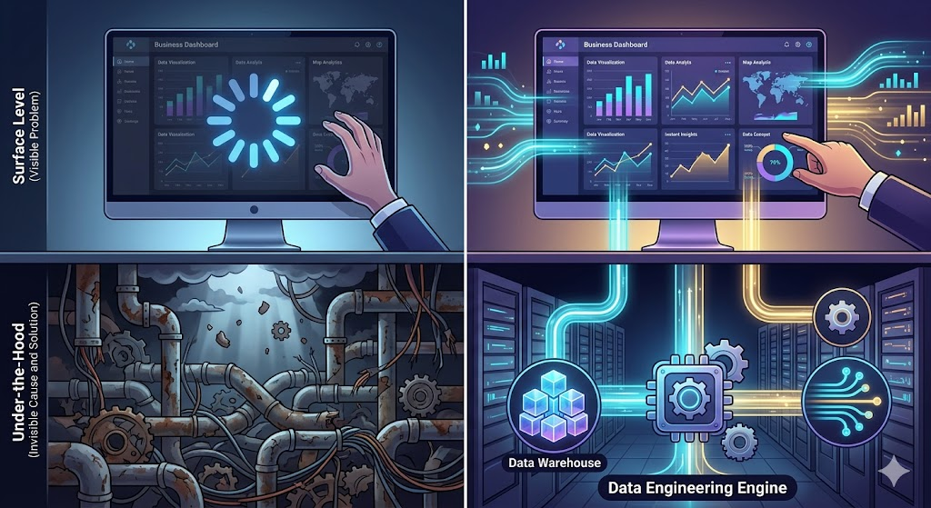A lentidão no dashboard é apenas o sintoma. A doença, quase sempre, é uma arquitetura de dados disfuncional, falta de modelagem e a ausência de um processo de Engenharia de Dados estruturado.